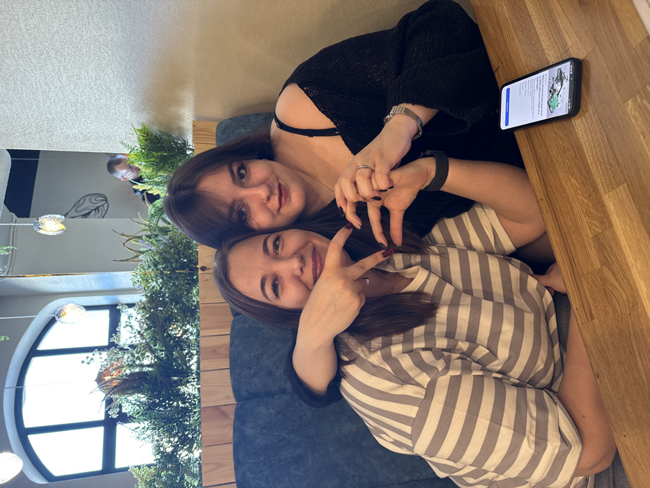 An indoor commercial establishment, identified as being in the city of Dmitrov, Russia, serves as the setting. Two young adult females are positioned in the foreground, seated at a light wood-grain table within a booth featuring a dark blue upholstered backrest. The female on the left has light brown hair and wears a grey and white horizontal striped t-shirt. Her right arm is around the shoulders of the female on the right, and her left hand is interlocked with the right female's right hand to form half of a heart shape, displaying dark nail polish. She is smiling and looking towards the camera. The female on the right has dark brown hair, prominent dark eye makeup, and a nose ring (septum piercing). She wears a black off-shoulder knitted top, a ring on her left ring finger, a silver-toned watch on her left wrist, and a dark smartwatch on her right wrist. Her left arm is around the shoulders of the female on the left, and her right hand completes the heart shape with the left female's hand. She is also smiling and looking at the camera. A black smartphone lies face-up on the table to the right, displaying text and an image of a product on its screen. In the background, behind the subjects, a wooden slatted wall and a planter box filled with various artificial green plants are visible. Above the plants, an arched window lets in bright ambient light. Suspended from the ceiling are decorative pendant lights with textured glass shades. A mirror on the right wall reflects a partial view of a male individual wearing glasses, appearing to be seated further back in the establishment.