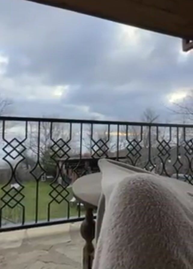 The camera is positioned on a covered patio, looking outward through a black wrought-iron railing. The patio floor appears to be made of stone slabs. A small round table with a turned leg is visible, partially covered by a tan, fluffy blanket. To the right of the table is a small black side table with two potted plants. Beyond the railing is a green lawn with a small wooden structure in the distance, surrounded by bare trees. The sky is overcast with grey clouds. The video has a slightly upward angle, showing the wooden ceiling of the patio.