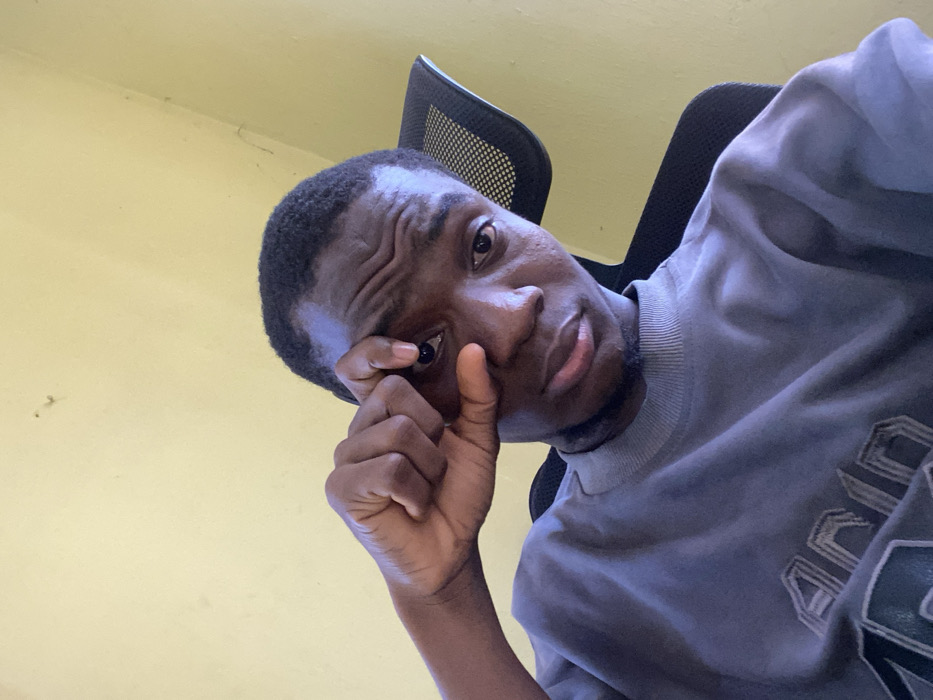 An indoor close-up image depicts a young adult male in Egan, Nigeria, seated and looking directly at the viewer. He has short dark hair and dark skin, wearing a grey long-sleeved shirt with partial dark grey lettering visible on the chest. His left hand is raised to his face, with the thumb and index finger pinching the skin around his left eye, causing it to appear slightly widened or taut. His right eye is fully open. His forehead exhibits furrows, and his mouth is closed with a slight pout. A black mesh office chair backrest is visible behind his right shoulder. The background is a plain, light yellow-ochre colored wall displaying minor surface imperfections.