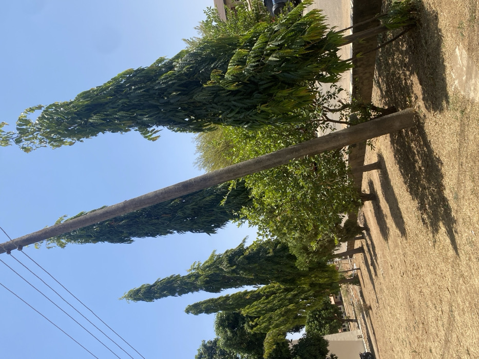 This image depicts an outdoor environment in Tudun Nupawa, Nigeria, under a clear, bright blue sky with no visible clouds. A prominent gray concrete utility pole stands vertically in the mid-right foreground, extending towards the top of the frame. Three distinct utility lines are visible, strung horizontally from the pole towards the upper left. The ground in the foreground and midground is covered in dry, light brown and yellowish vegetation, consistent with parched grass or earth. Shadows from the utility pole and trees are cast distinctly towards the lower-left, indicating direct sunlight from the upper-right. A row of at least six tall, slender trees with dense, dark green, somewhat pendulous foliage (resembling Polyalthia longifolia) extends from the mid-left into the background, parallel to a discernible boundary. Further green, bushier foliage from smaller trees and shrubs is present at various heights, primarily in the midground and behind the utility pole to the right. In the background, a low concrete wall or curb runs horizontally behind the line of trees. Beyond this wall, a paved surface, likely a road or pathway, is visible. A section of a light-colored building with a visible window or opening is partially observed on the far left background. A dark-colored vehicle, possibly an SUV, is partially visible parked on the far right background, obscured by foliage. A motorcycle with a black seat is partially visible on the far left background. No human figures or animals are present in the scene, and no overt actions or interactions are occurring. The environment appears to be an urban or semi-urban area, possibly a campus or public space, characterized by clear weather and dry ground conditions.