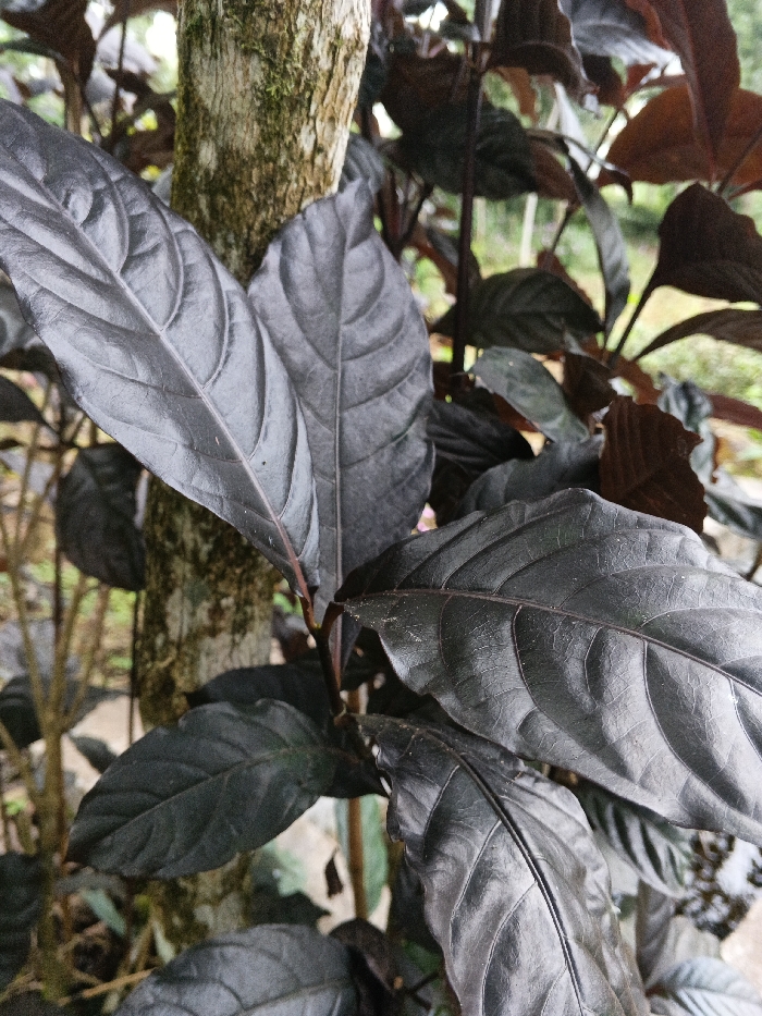 A close-up, vertical shot depicts a dense arrangement of plant foliage. The foreground is dominated by multiple large, ovate leaves, uniformly dark purplish-black in color, displaying prominent venation and a semi-glossy texture. These leaves emanate from slender, dark stems, partially visible. Positioned behind and slightly to the left of the central foliage, a textured tree trunk with light brown bark and patches of green moss stands vertically. The background consists of blurred vegetation, characterized by shades of dark green and reddish-brown leaves and stems, indicating a lush botanical environment. No human subjects, animals, or discernible actions are present. The scene captures static plant life. The location is the city of Unknown, Vietnam.