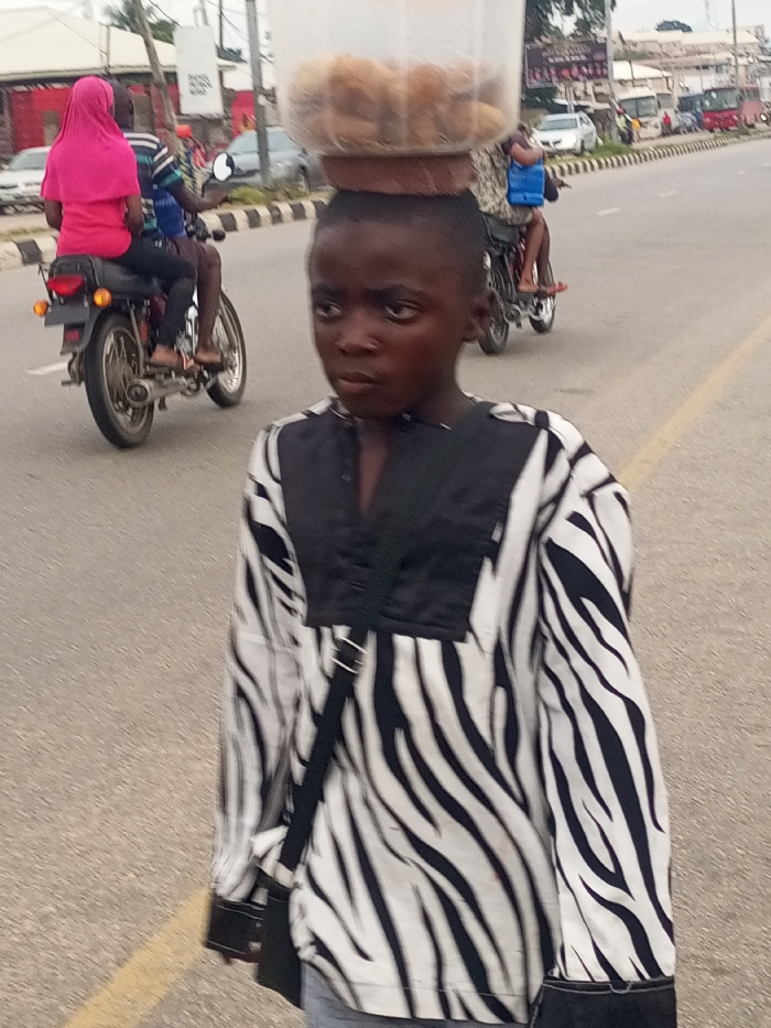 The image depicts an outdoor scene on an asphalt road in Lokoja, Nigeria. The central foreground features a dark-skinned male child, approximately 8-12 years old, walking forward and looking slightly to the viewer's right. He wears a long-sleeved shirt with a white base and black zebra stripes, a solid black V-neck collar, and solid black cuffs. A black strap with a silver buckle crosses from his right shoulder, diagonally across his chest. On his head, he balances a clear cylindrical plastic container, which is full of numerous small, light-brown, round food items, supported by a dark, circular pad placed directly on his scalp. In the mid-ground, to the left of the child, a red motorcycle with two occupants moves away from the viewer. The rear passenger wears a bright pink headscarf and a matching pink top. The driver is partially visible in a striped shirt. Further back on the right, another motorcycle with a single rider is visible. The background shows a multi-lane paved road with a faded yellow dividing line and a raised median barrier. Commercial vehicles, including a silver car, a red bus, and several white vans or trucks, are visible in the distance along the roadside. Commercial signs, utility poles, and sparse trees line the far side of the road. The lighting is diffuse, indicative of an overcast day.