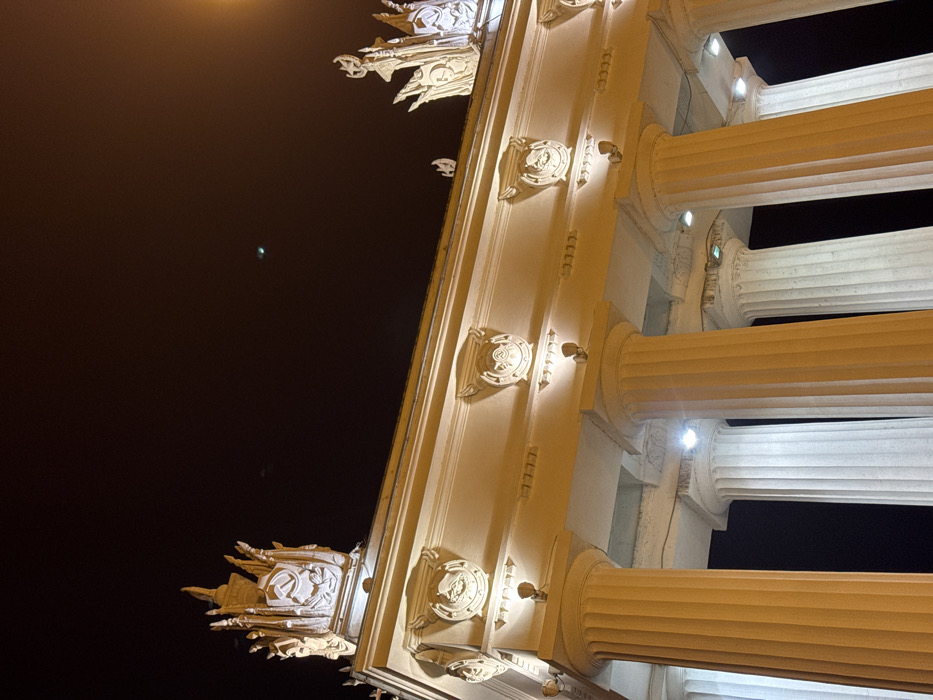 - "The image presents a low-angle, upward view of a neoclassical architectural facade at night, located in Volgograd, Russia" by FM-tCV213, licensed under CC BY 4.0