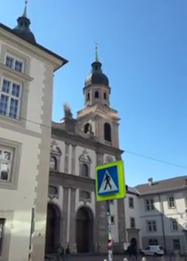 low-angle shot of a street with a large, ornate church building in the background. The church has a tall bell tower topped with a dome and a cross. The building is primarily white or light gray, with detailed carvings and architectural features. In the foreground, a pedestrian crossing sign is visible, featuring a blue triangle with a black figure walking. There are other buildings surrounding the church, constructed in a similar architectural style, also painted white or light gray. Several people are walking on the sidewalk in front of the church. The sky is clear and blue.