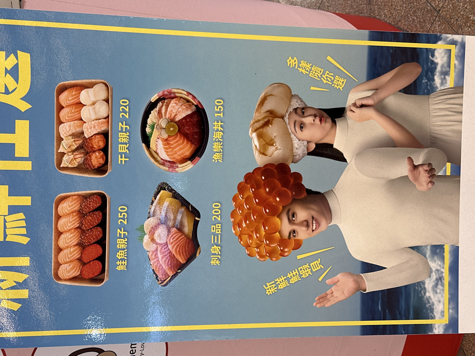 A blue sign advertises sushi and sashimi. There are photos of salmon roe sushi, scallop and salmon sushi, a sashimi assortment, and a seafood rice bowl. People wear hats resembling sushi ingredients; a woman wears scallop-shaped headwear, and a man wears salmon roe-shaped headwear. Prices are listed for each dish. The text includes menu item names, prices, and advertising phrases like "Fresh salmon and shrimp" and "Variety to choose from".