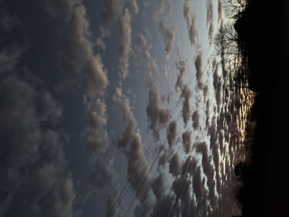 The image depicts an outdoor scene in Ball Ground, United States, during either dawn or dusk. The sky occupies approximately four-fifths of the frame, filled with numerous scattered and rippled clouds, predominantly dark grey and bluish-grey, with some exhibiting pinkish-orange and yellow illumination near the horizon. The sky transitions from a dark navy at the top to lighter blues and oranges/yellows towards the bottom. Five dark, parallel power lines traverse the middle-left of the frame diagonally upwards and to the right. The bottom fifth of the image shows a dark silhouette of a treeline, with bare branches visible against the brighter horizon. No people or active interactions are visible.