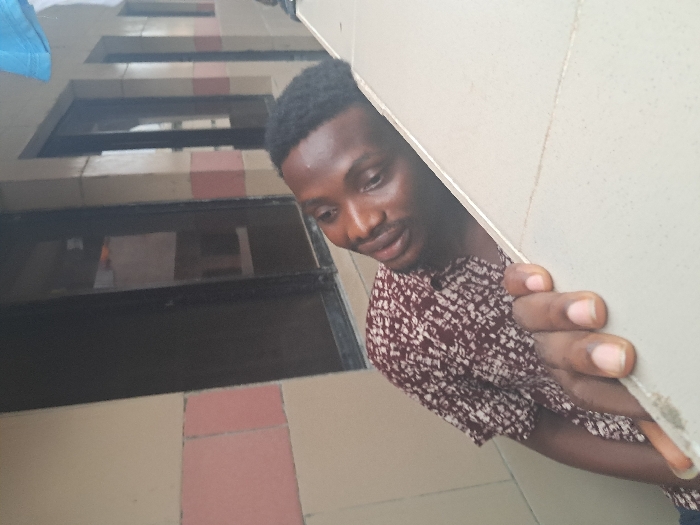 A man peers from behind a light-colored door or wall. He has short, dark hair and is wearing a patterned maroon and white shirt. His right hand grips the edge of the door. In the background, a beige building with dark-framed windows is visible. The building's facade has pink accents. The photo is taken at an angle.