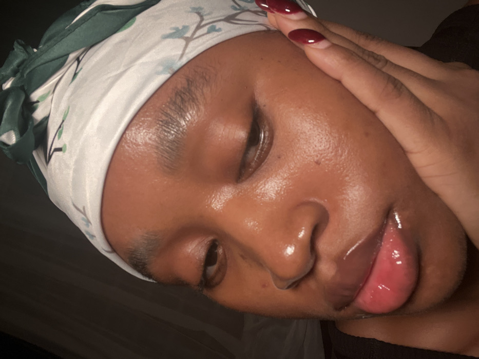 A close-up portrait depicts an individual with dark skin, located in Lagos, Nigeria. The person wears a white headscarf with a green leaf pattern, tied with a dark green knot, covering their head. Their right hand, featuring long, oval-shaped nails painted dark red with a lighter crescent at the base, rests gently against the right side of their face, partially obscuring the cheek. The skin appears moisturized or glossy, with visible pores and a few minor blemishes on the cheek and nose. The lips are full and glossy with a reddish tint, particularly on the lower lip. The visible left eye is cast slightly downwards. A dark-colored garment is visible on the left shoulder area. The background is dark and out of focus, indicating an indoor environment with low or directional lighting.