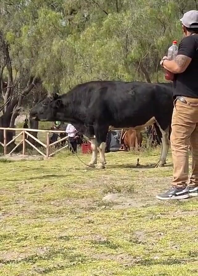 Here's a matter-of-fact description of the scene: **Setting:** The scene appears to be an outdoor area with green grass and trees in the background. There's a wooden fence in the middle of the frame. **Subjects:** A black and white bull stands in the center of the frame, secured by a rope tied around its neck. A person wearing a black t-shirt, khaki pants, a baseball cap, and sneakers stands to the right, holding a red bottle in their hands. **Activity:** The bull stands relatively still, occasionally moving its head. The person is standing still, observing the bull. Other people are visible behind the fence, along with what appears to be a horse. **Sounds:** Music plays in the background.