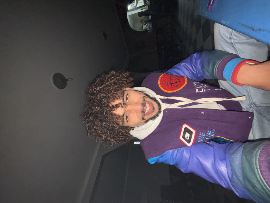 A man with curly hair and a beard smiles broadly, wearing a white hooded sweatshirt and a purple jacket with blue sleeves. The jacket has patches, including a face and a geometric design. The background shows a dark room, a checkered floor, and dim lighting. A blue table is visible on the right. The perspective is from a low angle.