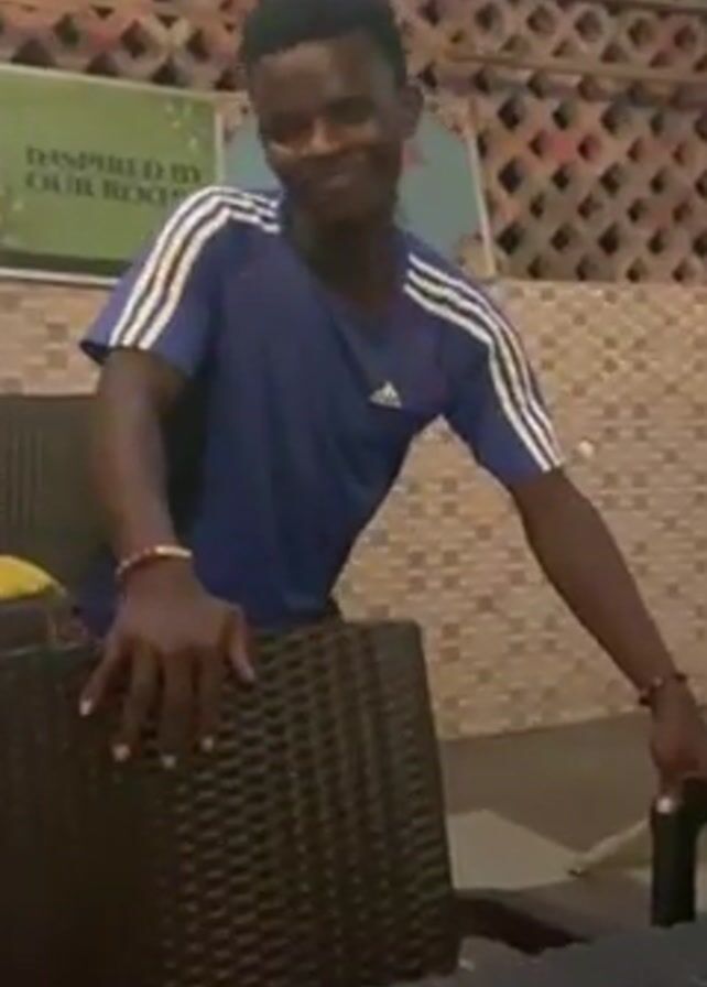 A young man dances behind stacked chairs at an outdoor bar, smiling and gesturing to the music. He wears a blue Adidas t-shirt and colorful shorts. Posters advertising beer are visible on the wall behind him, along with decorative latticework. The man’s hands are adorned with bracelets.