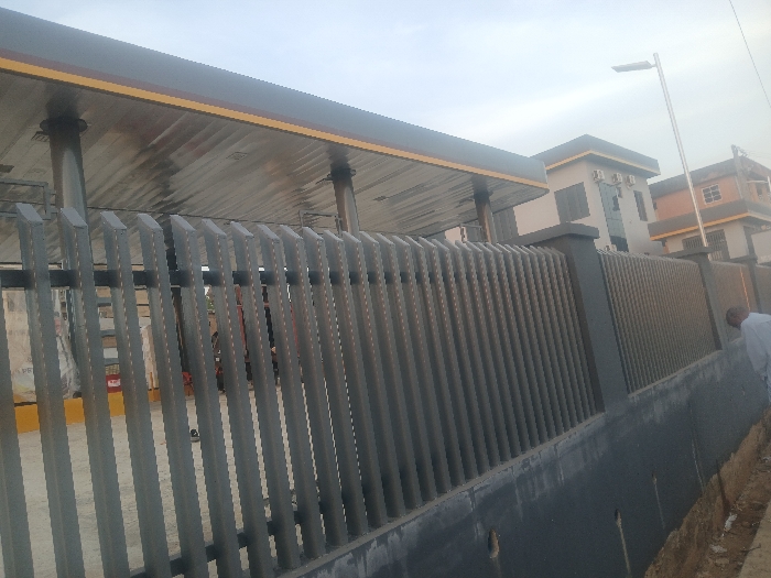 This image depicts an urban scene in Sardauna, Nigeria, observed during daytime under an overcast sky. In the immediate foreground on the right, a concrete drainage ditch runs parallel to the field of view, adjacent to a dirt pathway. A partially visible individual, wearing a light-colored garment, stands on this path, facing away from the camera. A dark grey fence, composed of vertical, angular metal slats atop a concrete base, extends horizontally across the midground, separating the foreground from the background elements. Behind the fence, to the left, a fuel station canopy with a dark grey roof and a yellow perimeter stripe is visible. The canopy is supported by multiple dark grey pillars, and faint reflections appear on its underside. Through the fence, indistinct shapes and colors suggest activity within the fuel station area, including a red object, possibly a fuel pump or signage, and blurred human figures. To the right of the fuel station, two multi-story buildings are situated behind the fence. The closer building is light-colored, featuring multiple windows, balconies, and exterior air conditioning units. A second, darker building, with visible windows and a balcony, stands further back and to the right. A tall, slender streetlamp, appearing to be solar-powered with a panel at its apex, is positioned in the background between the fuel station and the buildings. The overall environment suggests an active urban area with both commercial and residential structures.