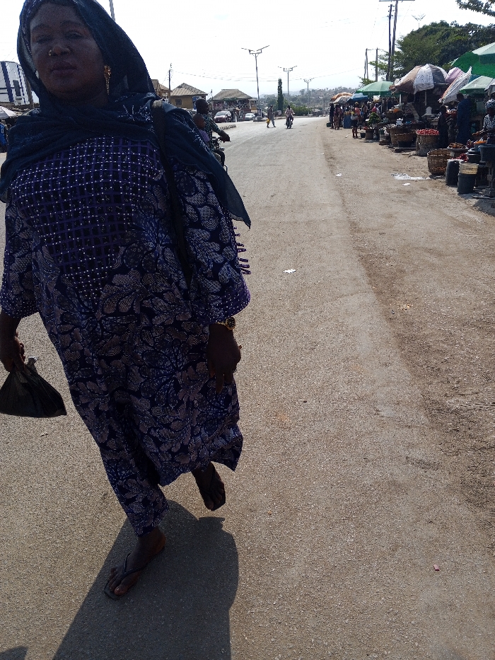 The image depicts a daytime scene on a street in the city of Zango-ndaji, Nigeria, characterized by a market activity on one side. In the foreground, slightly right of center, a dark-skinned individual, likely female, walks towards the viewer on an asphalt road. This individual wears a dark blue and purple patterned long dress or boubou, adorned with white or silver embellishments forming a grid pattern on the upper half and a floral/paisley design on the lower half. A dark blue or black headscarf covers the head and shoulders. A gold-colored earring is visible on the left ear, and a gold-colored wristwatch is present on the right wrist. A small, dark-colored object, possibly a bag, is held in the left hand. The person wears dark-colored flip-flops, casting a distinct shadow to their left on the road surface. The road extends into the distance, appearing as a primary thoroughfare. On the left side of the road, in the mid-ground, vehicles including cars and motorcycles are visible, indicating traffic. Buildings with reddish-brown roofs line this side further down. Multiple streetlights are positioned along the road. On the right side of the road, a vibrant market is active. Numerous individuals, identified as vendors and customers, are present amidst stalls. These stalls feature various goods, predominantly foodstuffs such as fruits and vegetables displayed in baskets and on tables. The market area is covered by multiple umbrellas and canopies, primarily white and green. Visible litter or debris is scattered on the ground near the market stalls. The overall environment suggests a sunny, clear day in a bustling urban setting.