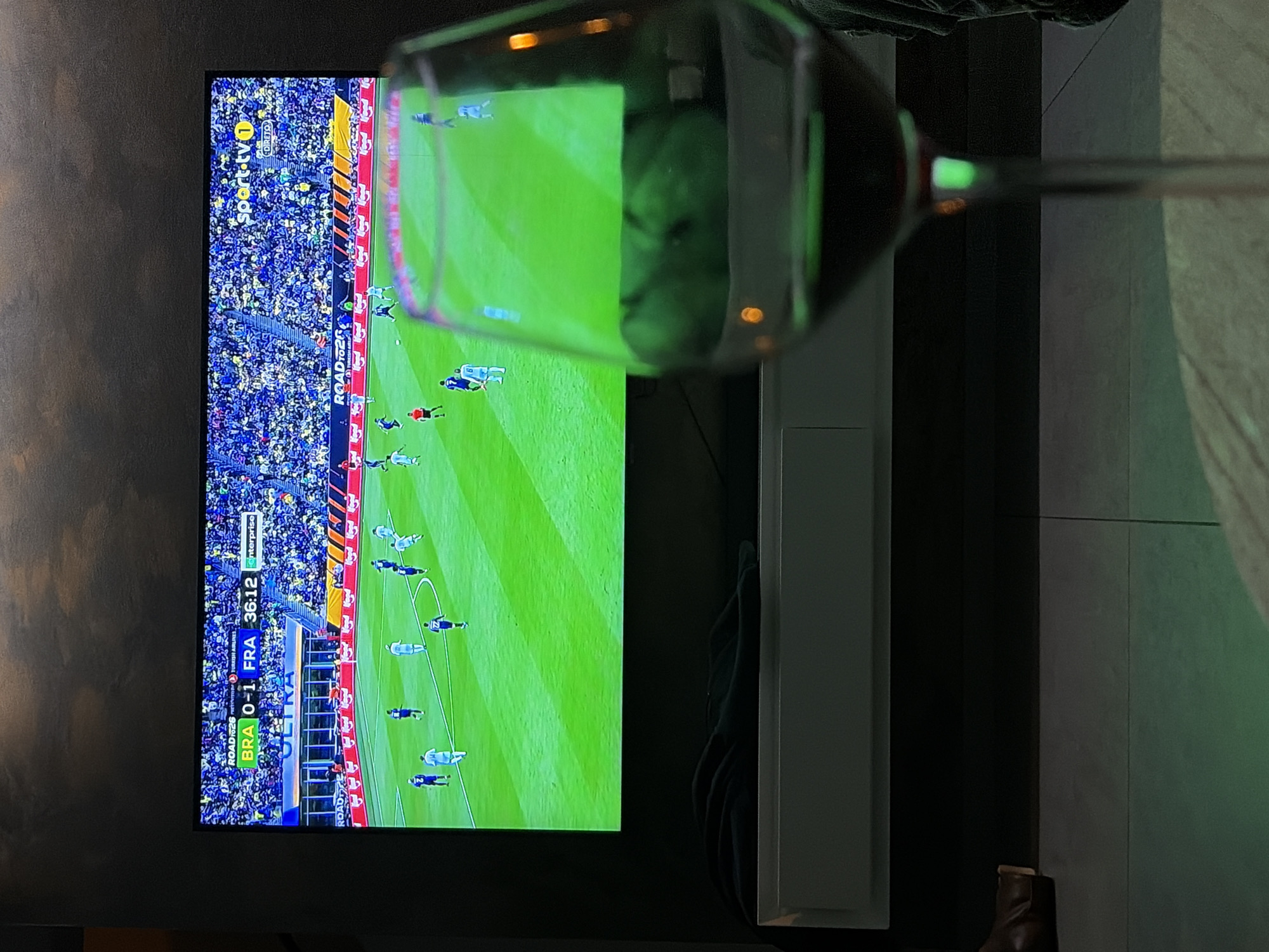 This image, captured in Pétange, Luxembourg, depicts an indoor scene focused on a television displaying a live soccer match. A large flat-screen television is mounted on a dark, textured wall, showcasing a game between Brazil (BRA) and France (FRA), with a score of BRA 0-1 FRA and a game time of 36:12. The broadcast is from "Sport.tv 1 DIRETO" and features on-screen sponsorships including "ROADTO26," "Turkish Airlines," "Enterprise," and "ULTRA." Multiple soccer players in light blue and white uniforms are visible on a bright green field, with a stadium audience in the background. Below the television, a white, wall-mounted console with drawers is visible, on which a dark, folded item rests. In the foreground, a stemmed wine glass containing red wine is positioned, out of focus, reflecting the green light from the television screen. The tiled floor below also shows a green reflection. A brown shoe or slipper is partially visible on the bottom left, indicating a viewer's presence, and a dark fabric object is partially visible on the bottom right.