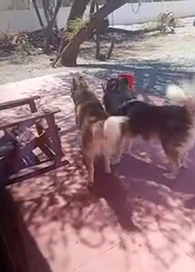two husky dogs standing on a red-tiled patio. One husky is predominantly grey and brown, while the other is lighter with tan and white fur. The dogs are facing the camera and wagging their tails. In the background, there's a red bucket, a small tree, and what looks like an arid yard. A partially visible wooden chair sits to the left of the dogs. The footage seems to be taken from inside a building, looking out through a doorway or window. The lighting suggests it's a sunny day, as shadows from the tree are cast on the patio.