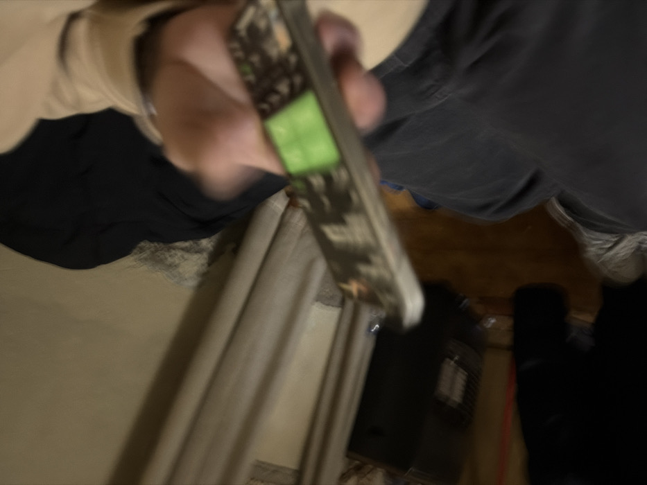 A person holds a remote control with a green screen. The view is downward, showing parts of the person's clothing, including a tan sweater, black skirt, and gray pants. The background includes a light-colored wall with vertical lines, a black object with a grid pattern, and an undefined darker area with a red cable. The image appears slightly tilted and blurry.