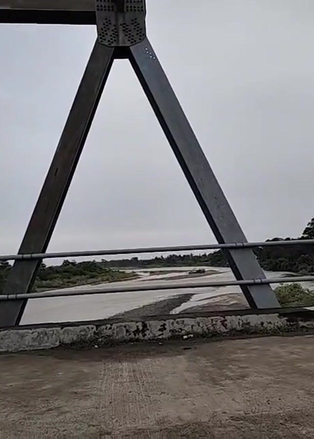 The camera is positioned on a bridge, looking out over a wide river. The river's water is a pale, silty color, and its course is marked by patches of gravel and low-lying vegetation. The opposite bank is lined with trees and shrubs. The bridge itself is a steel structure, with a distinct triangular support system made of gray steel beams riveted together. A metal railing runs along the side of the bridge. The sky is overcast, a uniform gray-white, suggesting a cloudy day.