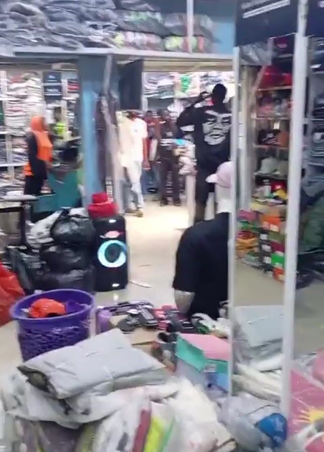 Inside what appears to be a clothing store, people move around