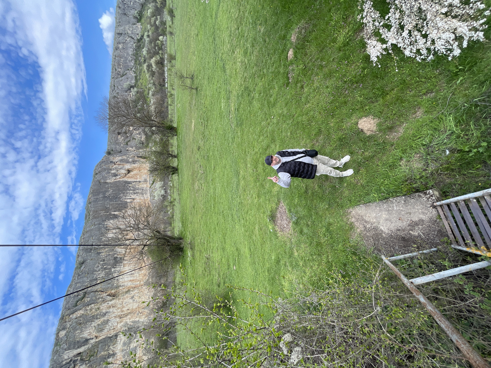 The scene depicts an outdoor environment adjacent to a cliff face, possibly within or near the village of Sadovets, Bulgaria. The terrain consists of a grassy field with scattered trees, extending from the base of the cliff. A person wearing a black baseball cap, a gray sweatshirt, a black vest, light-colored pants, and white sneakers is positioned in the field. The person is oriented towards the upper-right corner of the image, raising their left index finger in a pointing gesture. A rock face is visible on the left, with power lines stretched across the sky, extending from the rock face. In the lower right corner, a section of a weathered, metal fence or railing is visible. Flowering trees or shrubs are present in the upper right corner. The sky is blue with scattered clouds.