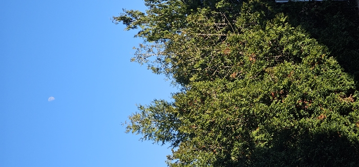 The image captures an outdoor daytime scene in Esch-sur-Alzette, Luxembourg. The upper third of the frame displays a clear, bright blue sky. A distinct first quarter moon is visible in the upper-left quadrant of the sky. The lower two-thirds of the frame are occupied by a dense arrangement of evergreen trees or tall hedges. The foliage presents various shades of green, with some interspersed brown-reddish elements, possibly cones or dried leaves. Sunlight illuminates the upper and front surfaces of the vegetation, creating shadowed areas towards the bottom and right of the foliage. A narrow, vertical, dark-colored object, consistent with a pole or post, is partially visible along the far-right edge of the frame, largely obscured by the dense vegetation. No individuals or specific activities are observable within the frame.