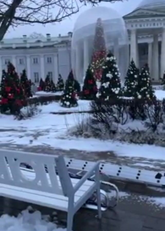 The video depicts a snowy winter scene in front of a grand, white building with a domed roof. Several Christmas trees decorated with red and white ornaments are scattered across a snow-covered area in front of the building. A large, transparent inflatable dome encases a tall Christmas tree in the center. A white park bench with silver metal armrests sits in the foreground, partially covered with snow. A collapsed ladder lies near the bench on a paved walkway. Bare tree branches frame the top of the shot against a cloudy sky.