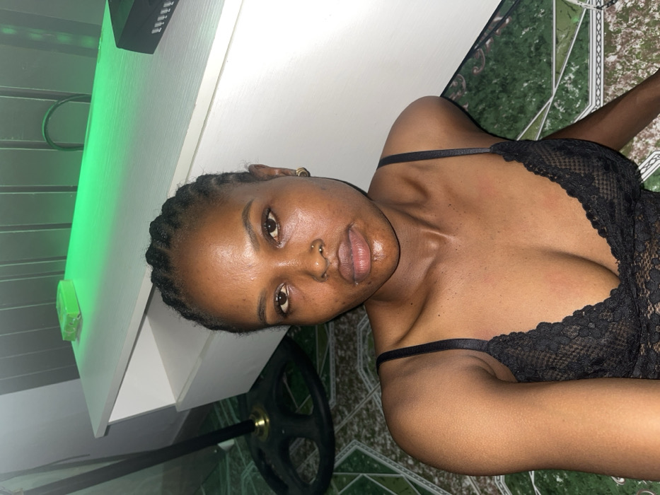 A woman with dark skin and braided hair is captured from above. She wears a black lace top with thin straps. A nose ring is visible. Her face is slightly turned toward the camera. Behind her, there is a white surface illuminated with green light. The background includes a dark weight on a stand and green-patterned flooring.