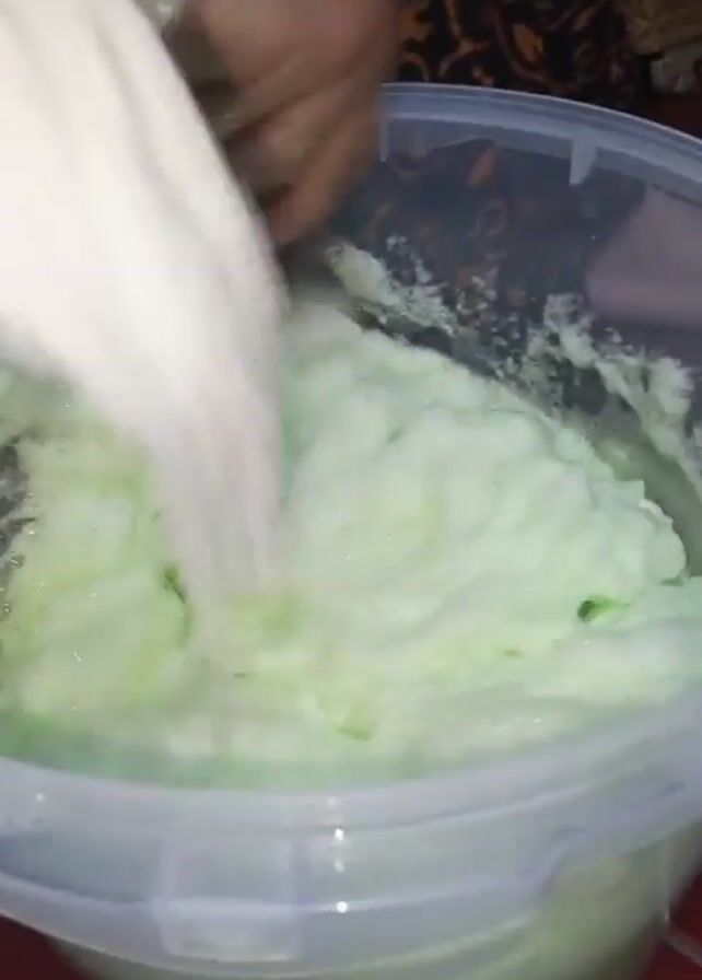 A person wearing a patterned top is adding white powder from a white plastic container into a large, transparent plastic tub filled with a frothy, light green liquid
