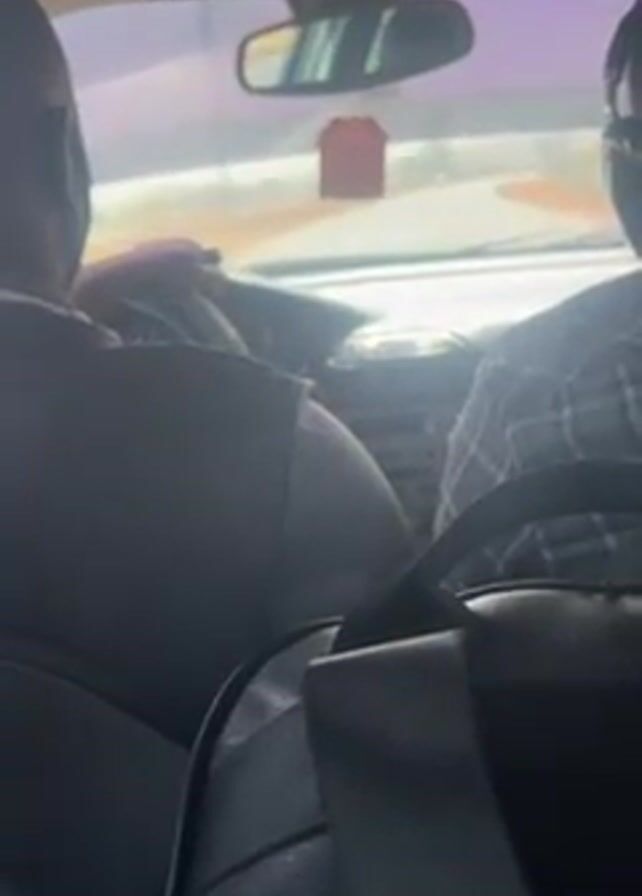 n interior view of a car, likely from the backseat. Two people are visible in the front seats, the driver and a passenger. The driver is wearing a dark-colored vest over a lighter shirt, and their hands are on the steering wheel. The passenger is wearing a plaid shirt. The dashboard of the car is visible, as is the road ahead through the windshield. A black bag is visible in the lower portion of the frame. The car appears to be moving on a paved road.