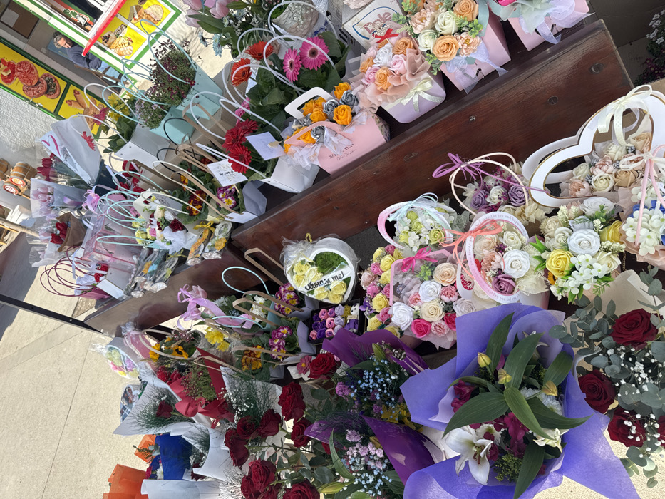 - "The image displays an outdoor flower stall located in Sofia, Bulgaria, showcasing a dense array of floral arrangements on a dark wooden surface under direct daylight" by FM-GT16t1, licensed under CC BY 4.0