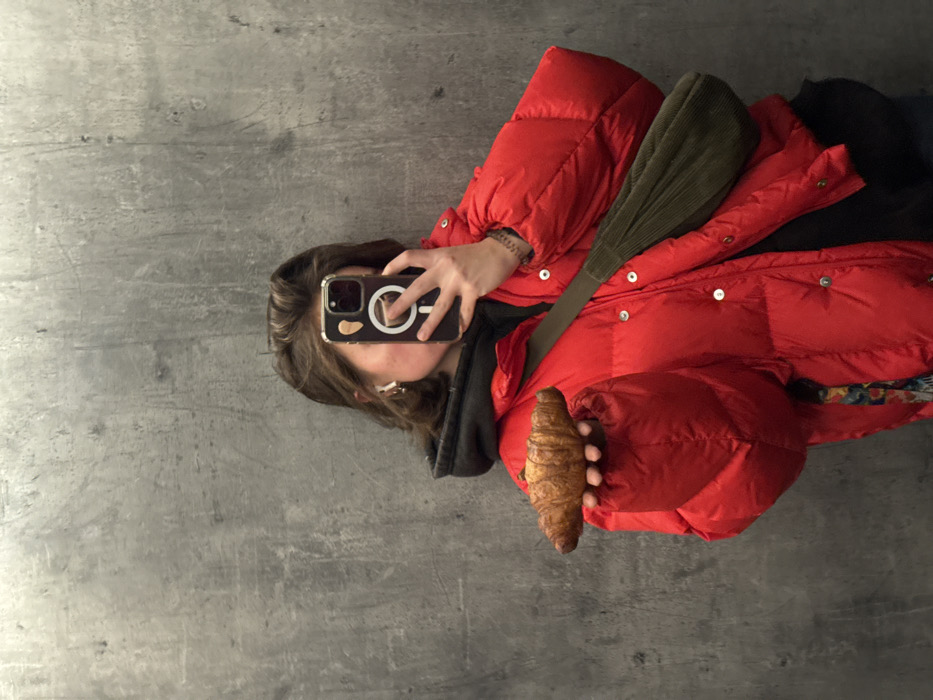 A person takes a selfie in a mirror, holding a croissant. The individual wears a red puffer jacket and a green corduroy bag slung across their body. The phone partially obscures their face. A gray wall is visible behind the person in the mirror.