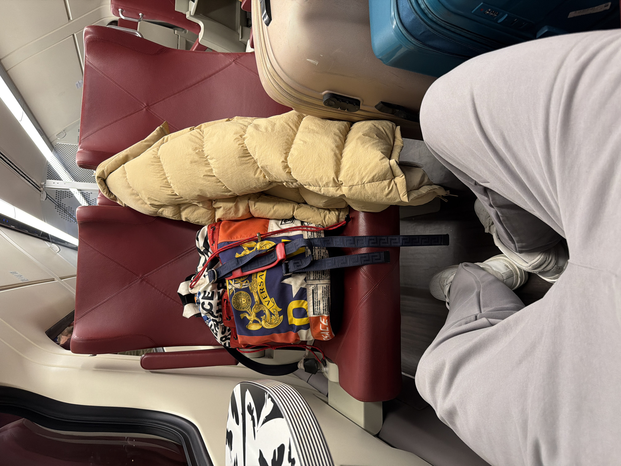 The image depicts an interior view, likely inside a train carriage. The scene is cluttered with personal belongings. Seating is visible, upholstered in a dark red material. A large piece of luggage, possibly a suitcase, sits above a folded puffer jacket. Beneath these are a backpack and other personal effects. The foreground shows a person seated, wearing grey pants and white sneakers. The overall setting appears to be a mode of transportation, given the presence of train-style seats and the overhead luggage. The image does not provide enough information to confirm a location in 's-Hertogenbosch, Netherlands.