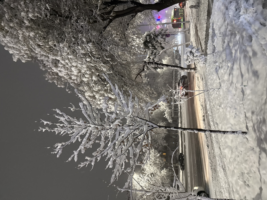 A snowy street scene at night. Trees are heavily coated in snow, their branches drooping. A road runs alongside, with a few cars visible, their lights reflecting. A green bus passes in the distance. Snow covers the ground, creating a bright contrast against the dark sky. A building with a light in the window is visible between the trees.
