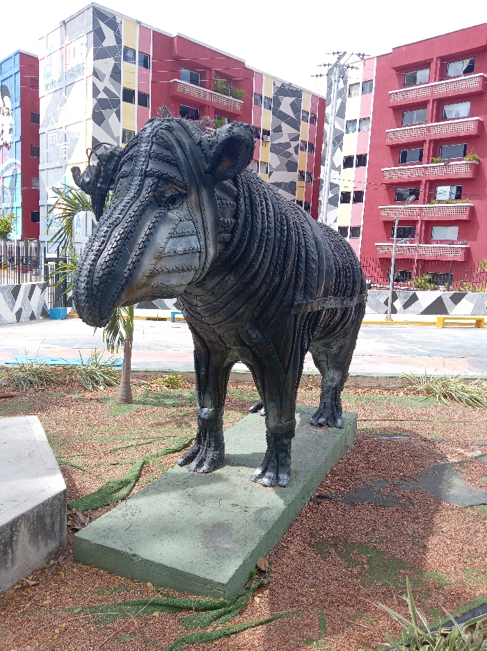 - "The scene depicts a large, dark-colored sculpture of a tapir, centrally positioned on a rectangular, light green concrete base in a public area of Las Tejerías, Venezuela" by FM-I9zNR2, licensed under CC BY 4.0