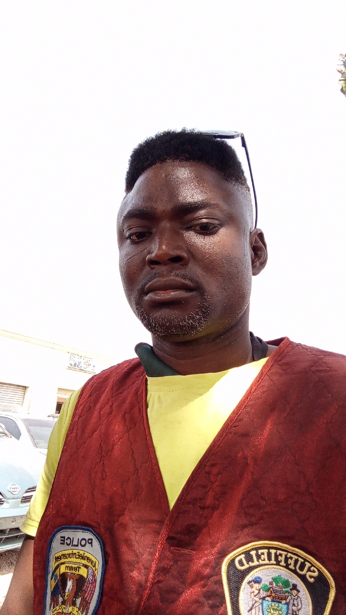 An adult male of dark complexion, with short black hair and a short, dark beard showing some grey hairs, is depicted in a close-up, head-and-shoulders view. A distinctive scar is visible on his left cheek. He wears a light yellow t-shirt beneath a dark red, quilted vest. Sunglasses are perched on his head. The vest features two embroidered patches: the left patch displays an inverted "POLICE Enforcement Team" with an eagle emblem, and the right patch shows an inverted "SUFFIELD" above an emblem depicting figures. His face appears moist, suggesting perspiration. In the background, partially visible to the left, is the front end of a light-colored vehicle (possibly a Nissan) and a segment of a light-colored building with a dark opening. The scene is set under bright daylight conditions in the city of Hayin Banki, Nigeria.
