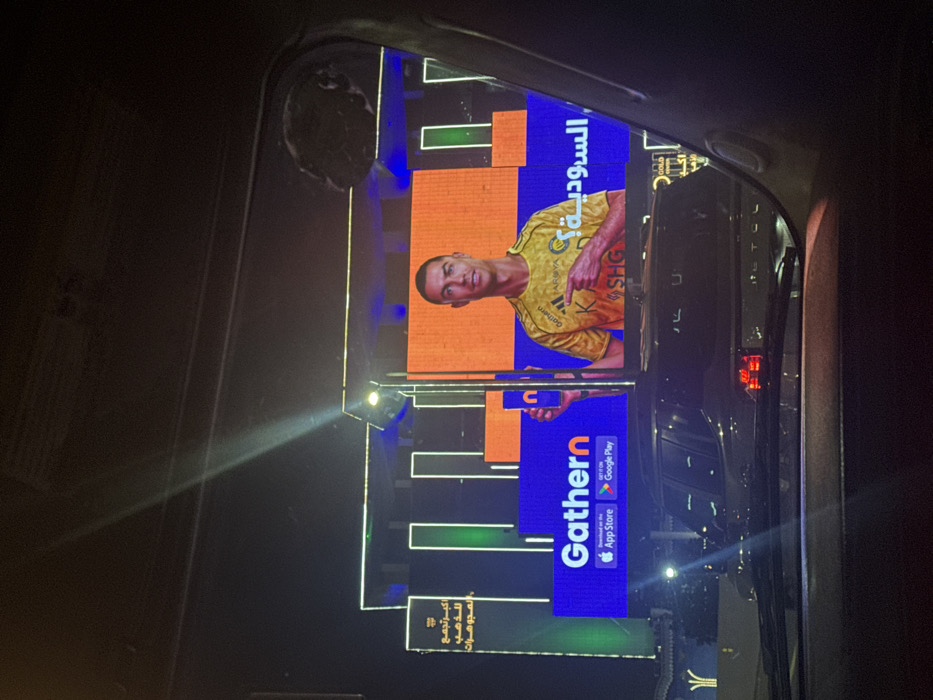 This is a nighttime photograph taken from inside a vehicle, looking out onto a street scene in Jeddah, Saudi Arabia. The central focus is a large, multi-panel digital billboard display. The most prominent section of the billboard features a smiling image of Cristiano Ronaldo, clad in a yellow Al Nassr FC football jersey bearing the "GatherN," "ARBIYA?," "SHG," and "K" logos. He is depicted holding a smartphone displaying the "GatherN" application logo and is pointing towards it with his right hand. Adjacent to Ronaldo, a blue panel prominently displays the "GatherN" name along with "Download on the App Store" and "Get it on Google Play" icons. To Ronaldo's right, another blue panel contains Arabic text, partially visible as "السعودية" (Saudi Arabia). Behind Ronaldo, the billboard incorporates orange rectangular sections. To the far left of the main billboard structure, a separate illuminated building facade features vertical green light strips and Arabic text at its base reading "اكبر تجمع الذهب المجوهرات" (Largest gathering of gold jewelry). In the foreground, elements of the capturing vehicle are visible, including the top of the dashboard, windshield wiper blades, and internal reflections. An external passenger-side mirror is partially visible on the upper right. Immediately in front of the capturing vehicle, a dark-colored SUV-type vehicle is partially visible, with its red taillights illuminated. The environment is dark, indicating night, with bright artificial light emanating from the billboards and other distant sources, creating streaks and reflections on the windshield.