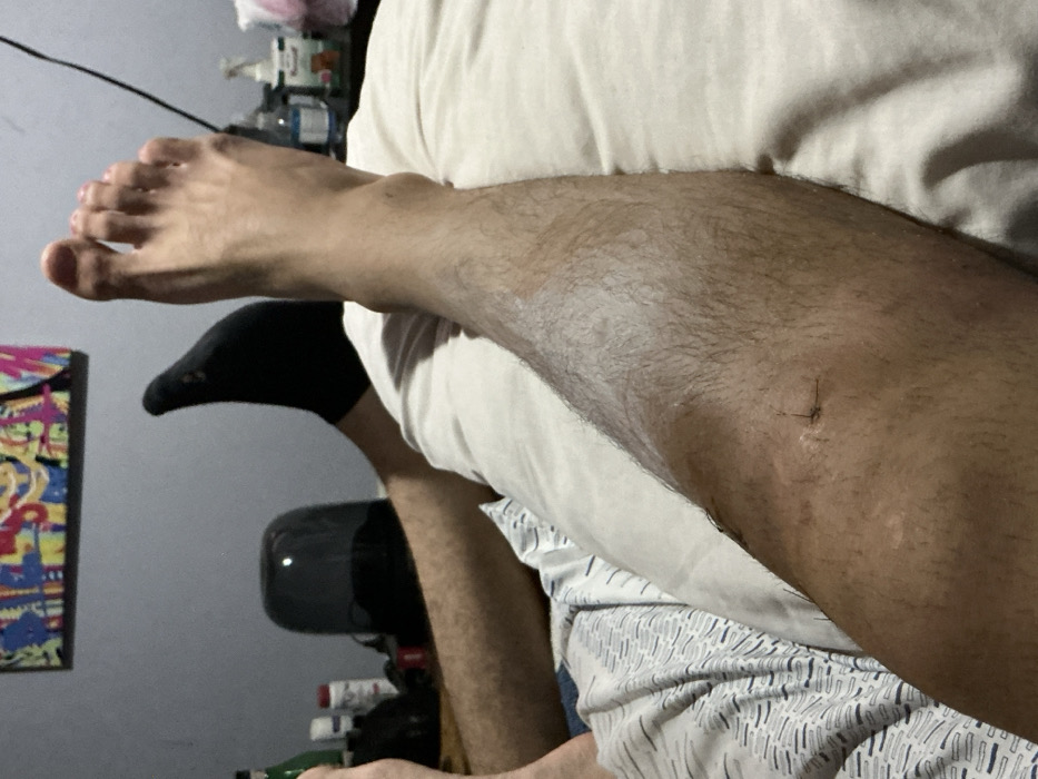 A person's leg rests on a pillow. The leg is hairy and has a small wound with a few stitches near the knee. The person is wearing a black sock on the foot further away. A bed sheet with a patterned design is partially visible. In the background, there's a wall, part of a colorful picture, and some objects on a surface. The lighting is dim.