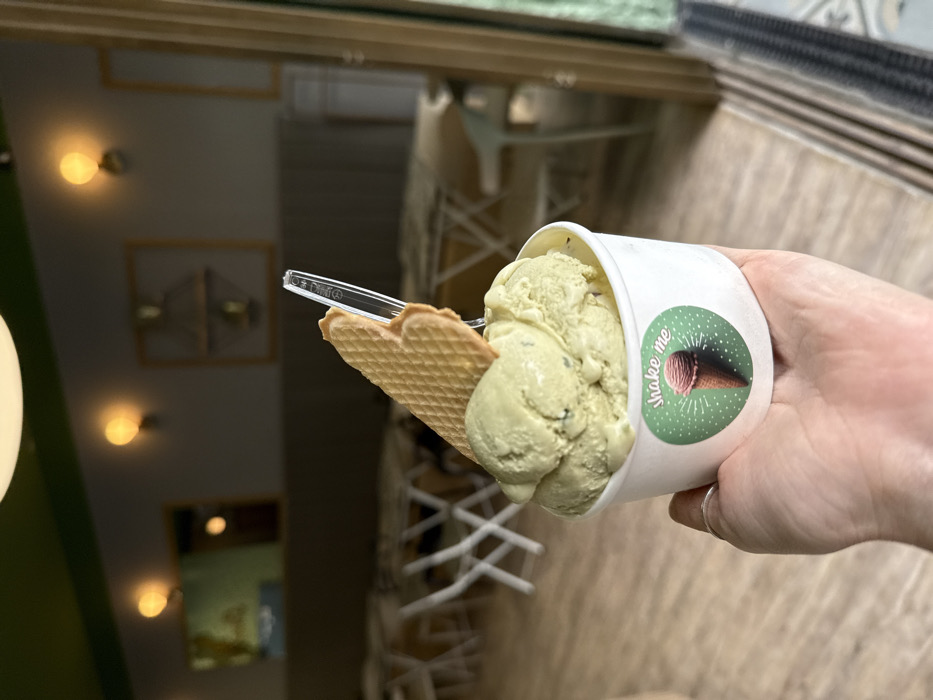 - "A light-skinned hand, adorned with a silver ring on the fourth digit, holds a white paper cup containing three scoops of light green, likely pistachio-flavored, ice cream with dark inclusions" by FM-rSR2K3, licensed under CC BY 4.0