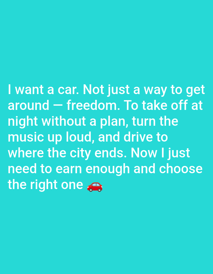 This digital image, for which the specified location is Lviv, Ukraine, presents a uniformly teal-colored background. White sans-serif text is centered vertically in the lower half of the frame, occupying multiple lines. The text reads: "I want a car. Not just a way to get around — freedom. To take off at night without a plan, turn the music up loud, and drive to where the city ends. Now I just need to earn enough and choose the right one". A small, rendered red sedan emoji (🚗) concludes the textual content on the bottom line. No individuals, physical objects other than the text and emoji, or specific environmental features of Lviv or any other city are depicted within the image itself. The image functions as a textual statement on a flat graphic field.