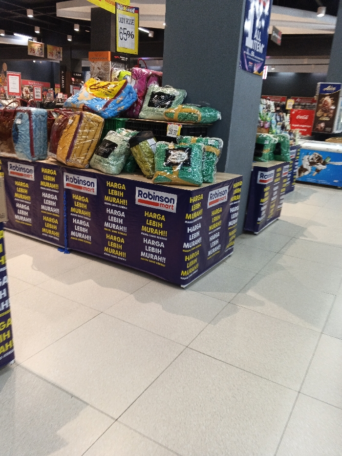 A retail display at Robinson Mart showcases various bedding items, including pillows and blankets, wrapped in clear plastic. Signage with "HARGA LEBIH MURAH!!" (Price is More Affordable!!) is prominently featured on the display. A "Lady Rose 65%" discount sign is visible. The items are neatly arranged on top of the displays. Other retail sections are visible in the background, including refrigerators with food products and aisle endcaps with merchandise. The store has tiled flooring.