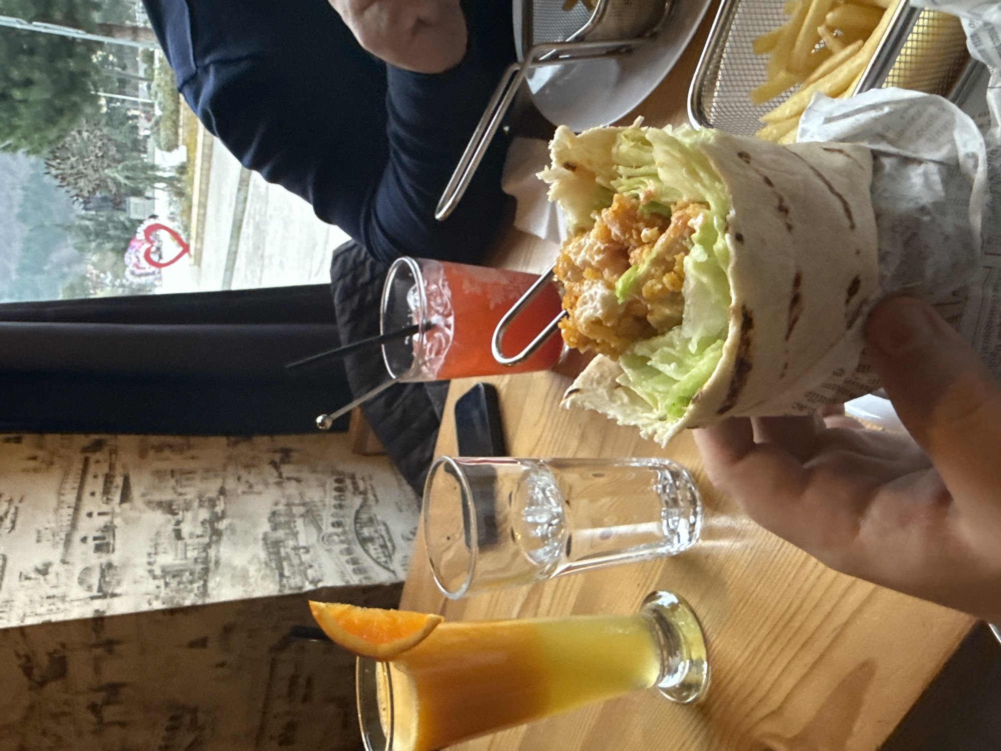 A person is dining at a restaurant, possibly in Vratsa, Bulgaria, judging by a faint view of a heart-shaped decorative structure outside the window. The person is holding a wrap filled with lettuce and what appears to be fried chicken or another protein, wrapped in paper with writing on it. The wrap is being held in the right hand of the person. Other items on the table include a glass of orange juice garnished with an orange slice, a clear glass of water, a glass of reddish-orange liquid with a straw, and a basket of french fries. Part of another person's arm can be seen in the upper left. The table has a light-colored wood surface. A section of wall or partition with a pattern of ancient ruins or maps is visible behind the table.