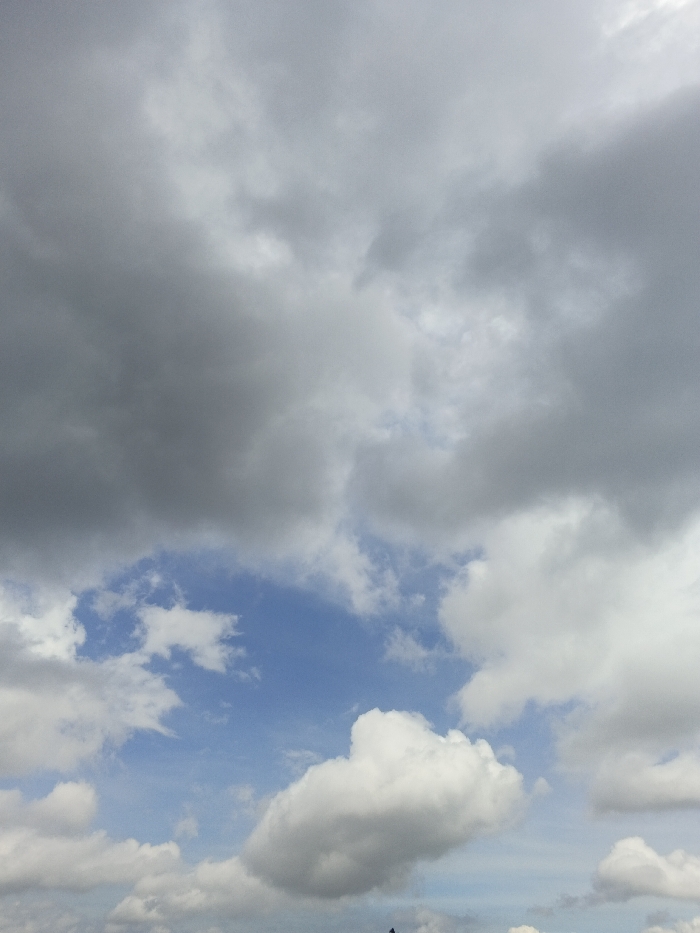 This image presents a view of the sky over Ngọc Tụ, Vietnam. The upper two-thirds of the frame are covered by a dense formation of dark gray and light gray clouds, indicative of overcast conditions. A prominent, irregular opening in the cloud cover in the lower-middle reveals a section of clear blue sky. Beneath this opening, several discrete white cumulus clouds are visible. The bottom edge of the frame shows additional scattered lighter clouds. No terrestrial features, human presence, or man-made objects are discernible.
