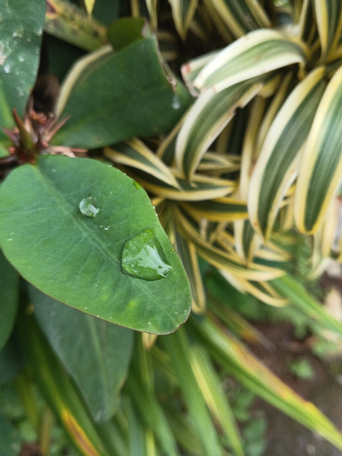 A close-up image showcases vibrant greenery. A glossy green leaf, adorned with two clear water droplets, takes center stage. Behind it, another green leaf and a thorny stem add depth. Adjacent to the green leaves is a cluster of long, pointed leaves with yellow and white stripes. The overall composition is soft and the colors are vivid, creating a fresh and natural aesthetic.