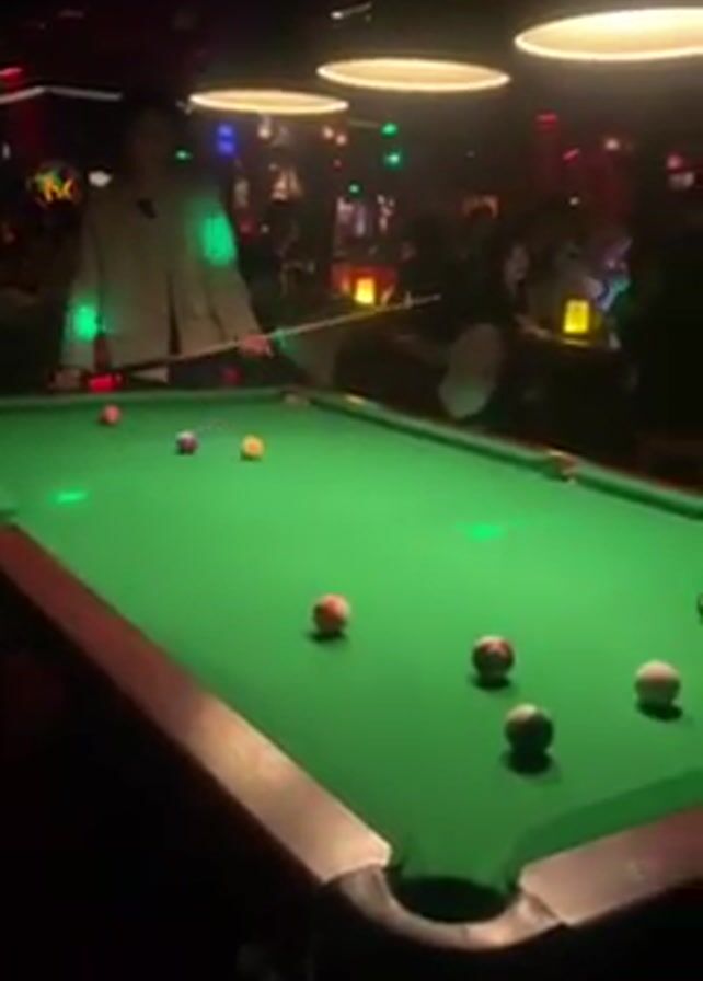 person preparing to play pool in a dimly lit bar. The person is wearing a light-colored jacket and holding a pool cue, aiming at the cue ball on a green pool table with several other balls scattered across it. The bar is crowded with people sitting at tables. The lighting is low, with bright lamps above the pool table and neon lights decorating the walls. The camera pans slightly to show more of the bar, including people seated at tables and bar stools.