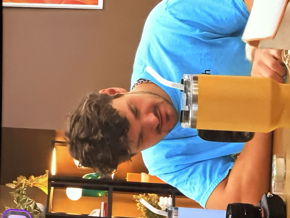 This image depicts an indoor scene within the city of Vienna, Austria, focusing on an adult male seated at a table. The man, presented from the chest up, has dark, wavy hair, a mustache, and a short beard. He is wearing a light blue short-sleeved t-shirt and a silver-toned chain necklace. His head is tilted downwards, and his gaze is directed towards an unseen point on the table. In the foreground, a prominent yellow-orange insulated tumbler with a handle, a clear lid, and a white plastic straw stands upright on the table, containing an amber-colored liquid. To its immediate left, a portion of a light blue insulated tumbler with a white straw is visible. Further to the left on the table, a black object resembling a camera lens is present, along with a small, clear dispenser containing white adhesive tape. The background features a dark, open shelving unit on the left side, displaying various decorative objects. These include a golden figurine, a white spherical lamp with a green base, red-spined books, and two stacked orange cylindrical objects, possibly candles, all illuminated by a warm, yellow ambient light source emanating from behind the shelf. The right side of the background consists of a plain brown wall, against which a vertical orange-red element within a white frame is partially visible. No specific landmarks or unique architectural features within the image enable a precise identification of the location within Vienna.