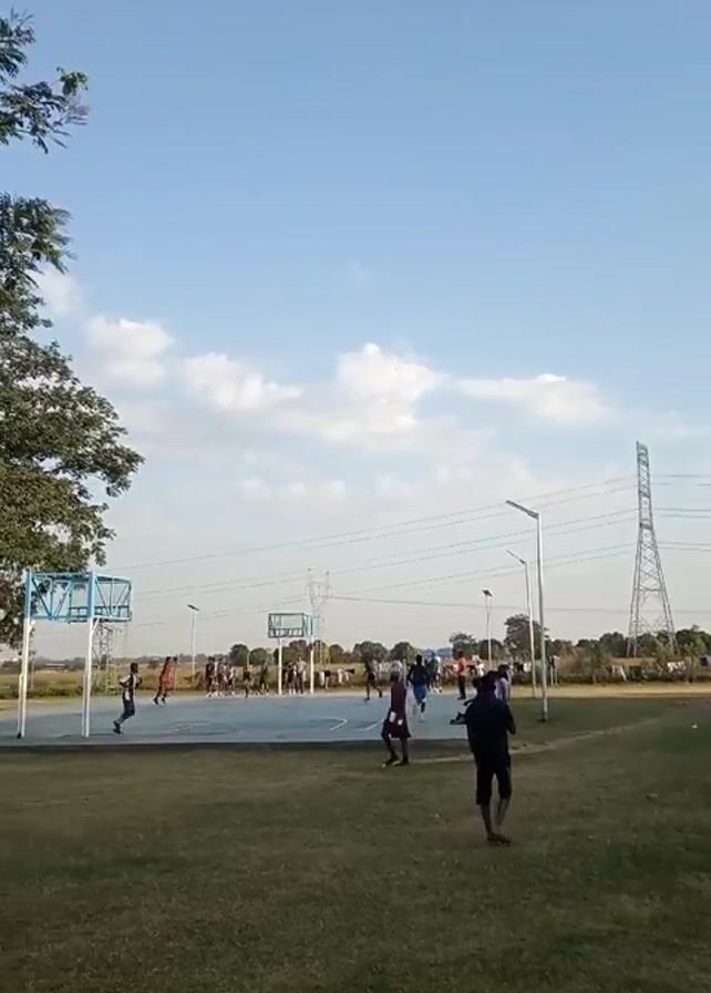 The video depicts a park with a basketball court. People are playing basketball on the court. Other individuals are present around the court, either watching or walking by. A large tree is present on the left side of the frame. The sky is visible with some clouds. In the background, a power line tower can be seen. The overall environment appears to be a recreational area.