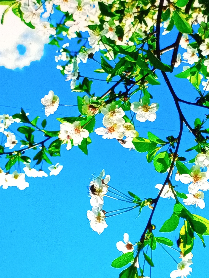 White blossoms with yellow centers adorn a tree branch against a vibrant blue sky. Green leaves accent the flowers. A circular cloud is visible in the top left corner. A bumblebee is perched on one of the lower blossoms. The scene is bright and colorful, evoking a sense of springtime.