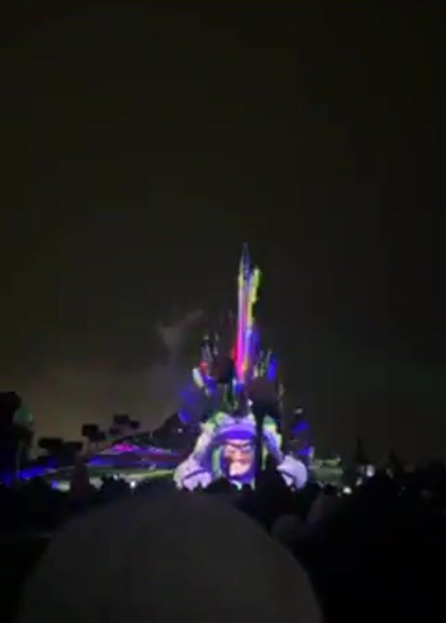 nighttime view of a Disney castle illuminated with colorful lights and projections. The castle is the main focus, with rapidly changing colors and patterns. The video shows a large projection of Buzz Lightyear on the base of the castle. There are crowds of people in the foreground, partially obscuring the view, suggesting that the viewer is part of an audience. The overall atmosphere suggests a lively and entertaining light show at a Disney theme park.