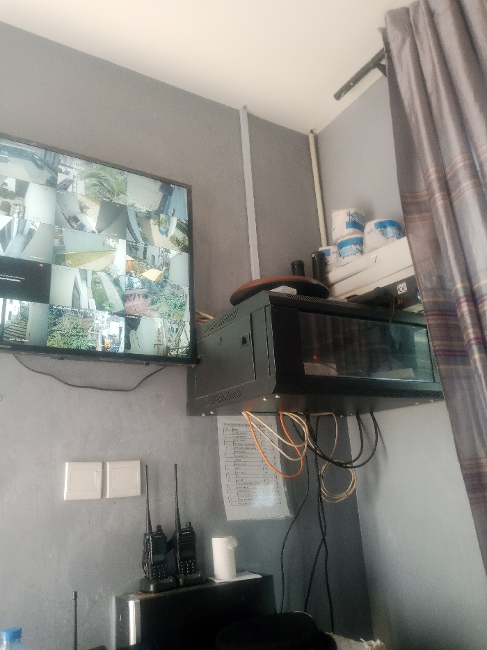 An interior scene depicts a security monitoring station located in Abuja, Nigeria. The room features light grey walls and a white ceiling. A large, black-framed flat-screen monitor is mounted on the left wall, displaying a 4x4 grid of 16 active surveillance camera feeds. These feeds show various outdoor perspectives, including sections of manicured greenery, paved pathways, and building exteriors. Below the monitor, two white electrical wall plates are visible. On a surface beneath these, two black walkie-talkie transceivers, complete with extended antennas, are upright in their charging cradles. A partially visible blue plastic water bottle is positioned to the left of the radios. To the right of the monitor, a black, wall-mounted network or control rack is situated. This rack has a transparent front panel, through which an orange indicator light is visible inside. On the top surface of the rack, a dark, circular, shallow container rests adjacent to several rolls of white toilet paper, which are packaged in blue with a palm tree motif. These items are stacked atop a white electronic device. Directly below the rack, a printed document, featuring a grid or list, is taped to the wall. A cluster of multi-colored cables (orange, white, and black) extends downward from the bottom of the rack. On the far right of the frame, a grey curtain with subtle horizontal stripe patterns is drawn. White electrical conduit pipes run vertically along the wall in the upper right corner. No individuals are present in the depicted scene. The exact address or specific area within Abuja, Nigeria, is not identifiable from the visual information.