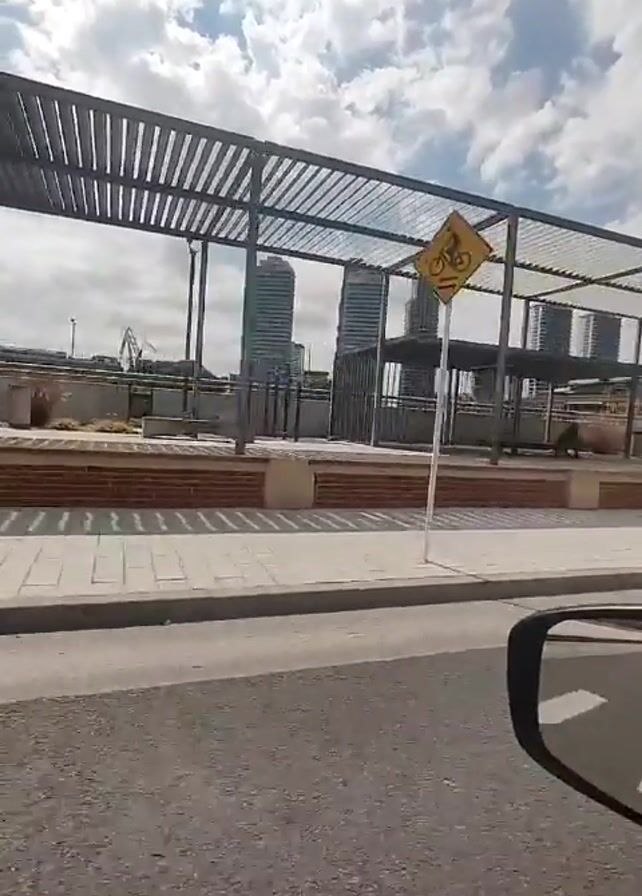 From inside a moving vehicle, the video shows a view of a city street on a partly cloudy day. A covered structure with a metal frame and horizontal slats is visible on the right, positioned over a brick and stone patio. In the background, several tall modern buildings can be seen. The vehicle passes by a pedestrian crossing with a white crosswalk, and a large tree is visible on the right. A person is walking on the sidewalk near a trash can. The side mirror of the vehicle reflects another car behind.