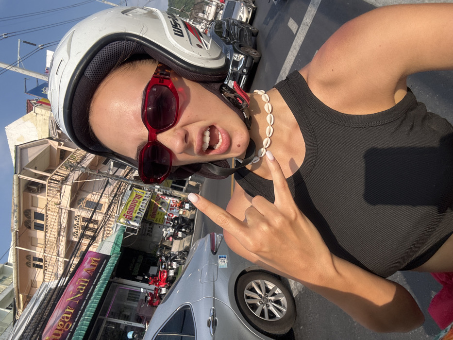 A female individual is captured in a close-up selfie on a sunny day in Patong, Thailand